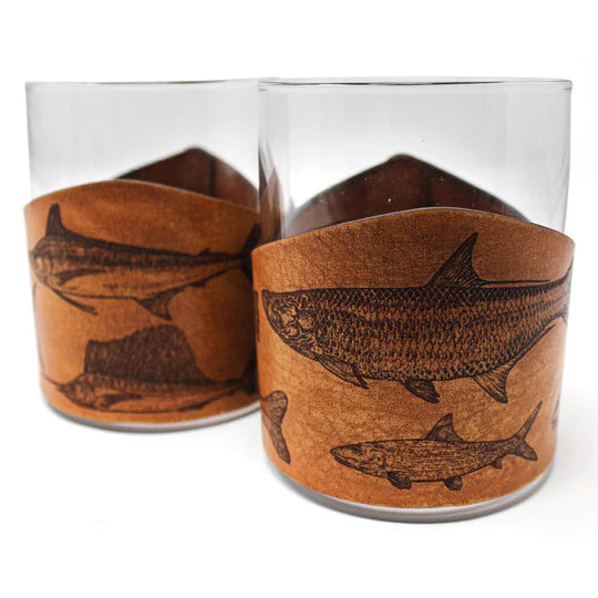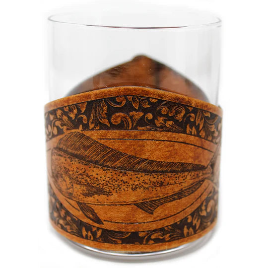 Our Fish Engraver series consist of a large variety of fish species wraps with 11 oz rocks glasses. This style is decorated with the Tarpon illustrated scientific study rendition and then framed with a classic rifle engravers pattern. Using thick 7-10 oz leather with precision programed laser engraving and fastened with a sturdy stainless steel marine grade snap. This design concept makes the leather wraps easy to unsnap for cleaning purposes or to simply stow away and change out for another wrap style. All leather is hand stained, hand distressed and hand finished which gives every piece it's own unique look.
